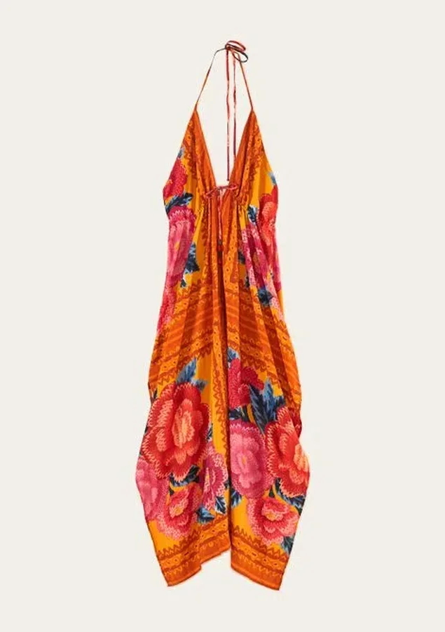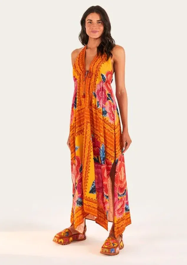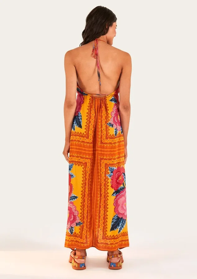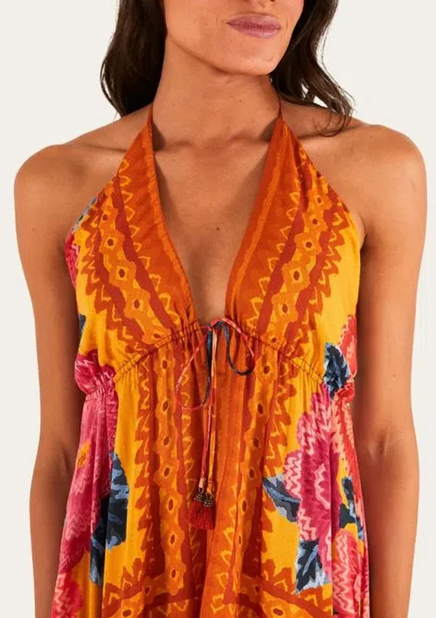Vestido cropped estampado dinamarca. modelo frente única com decote em v. alças finas com amarração no pescoço. tem detalhe de rolotê embutido no tecido bem abaixo do busto com amarração na parte da frente, finalizado com ponteiras de tassel de linha. o modelo é soltinho de viscose com detalhe de fendas longas nas laterais do vestido.