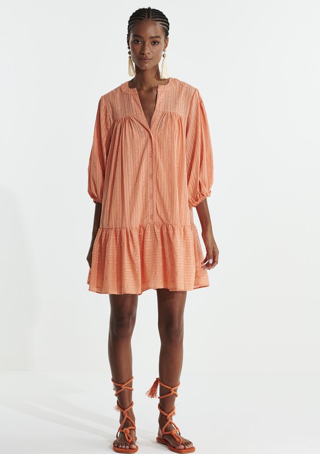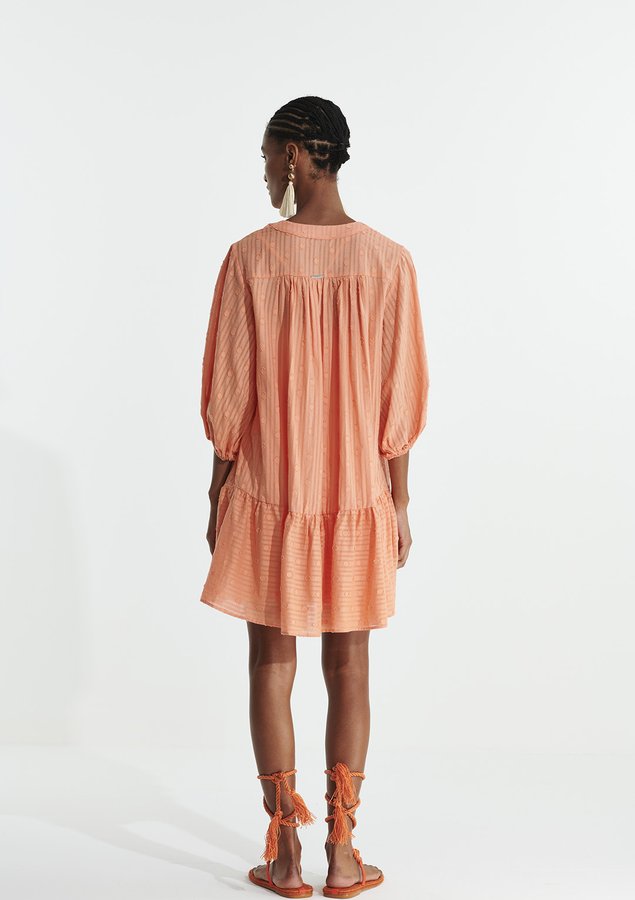 Vestido com shape solto e meia manga, possui botões na frente e pequenos babados. Acompanha forro interno solto da cor do tecido com alças reguláveis.