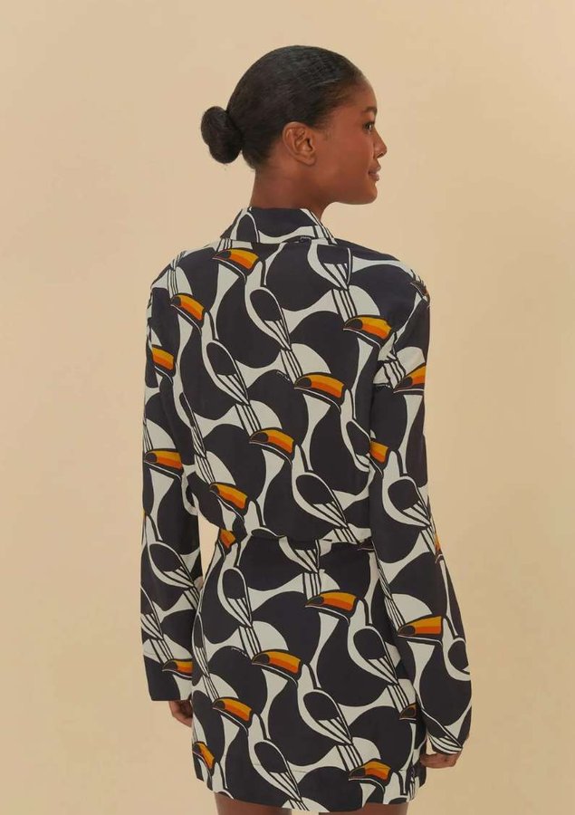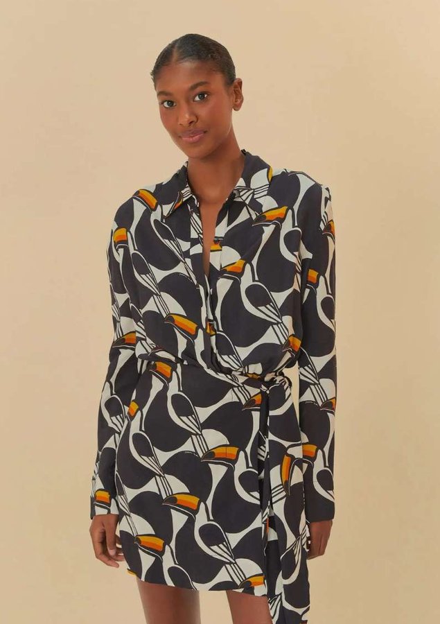 vestido curto estampado copatucano. com decote em v e mangas longas, essa peça traz um toque moderno e casual ao guarda-roupa. os botões frontais e a faixa na cintura permitem um ajuste confortável, enquanto a barra assimétrica adiciona originalidade. perfeito para um dia de lazer ou um encontro especial.