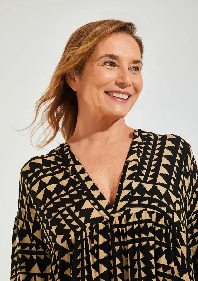 Vestido curto estampado, mangas amplas e decote V.