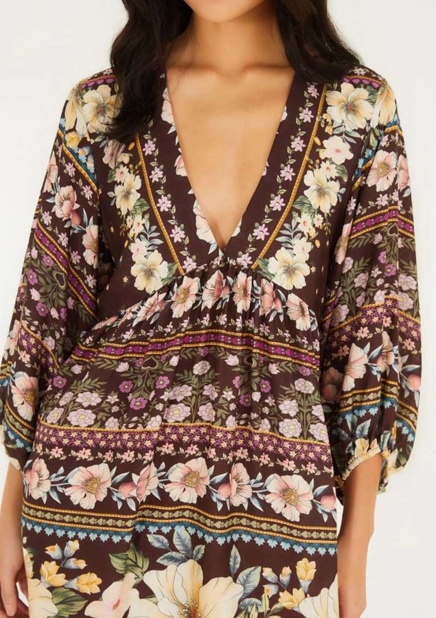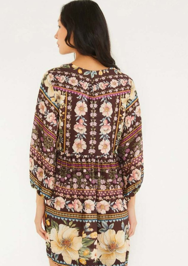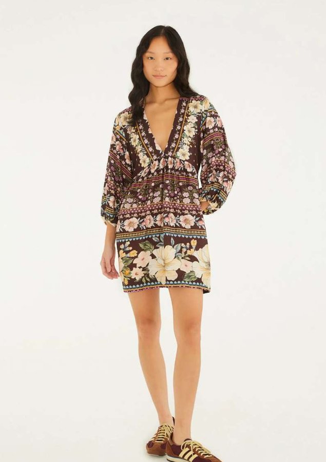 vestido curto estampado flori. com decote profundo em v, apresenta mangas longas e uma modelagem que destaca o estilo casual e alegre da estação. detalhes cuidadosos elevam a peça, perfeita para encontros descontraídos ou ocasiões especiais.