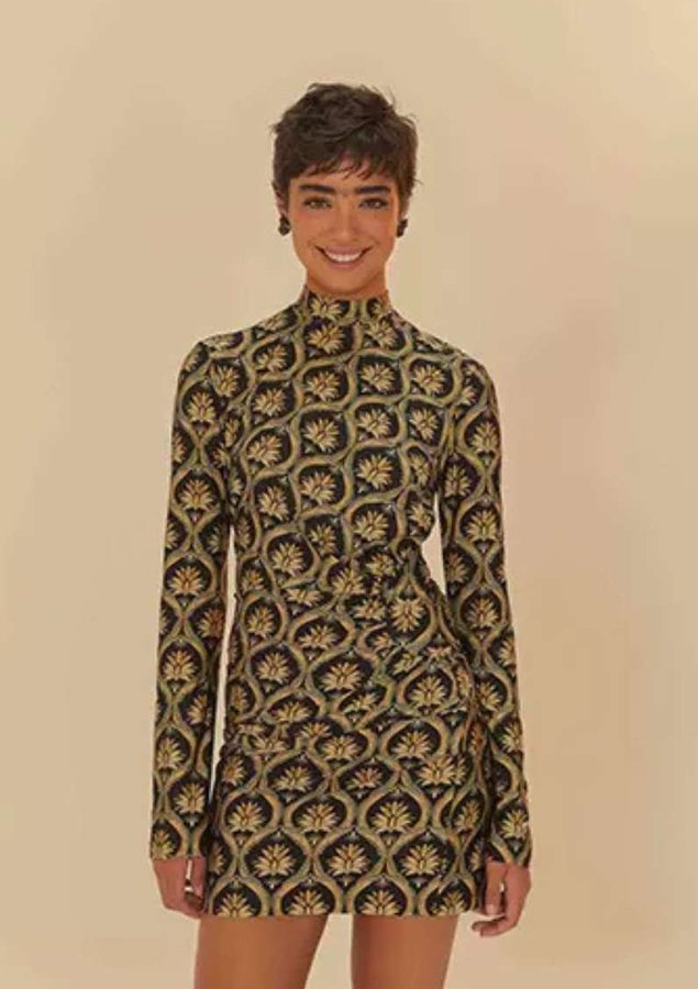 Vestido curto joia boho. Apresenta gola alta e mangas longas que trazem um toque de charme. enquanto a modelagem ajustada transmite uma presença marcante. fechamento discreto nas costas. versátil, se encaixa em eventos casuais ou em ocasiões mais especiais. uma peça autêntica para um guarda-roupa moderno. Aposte!