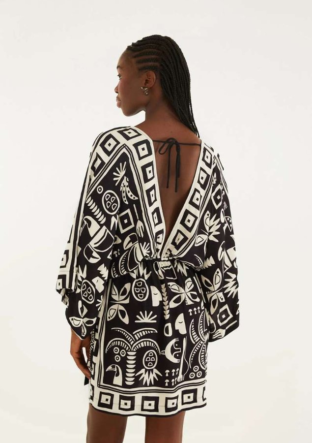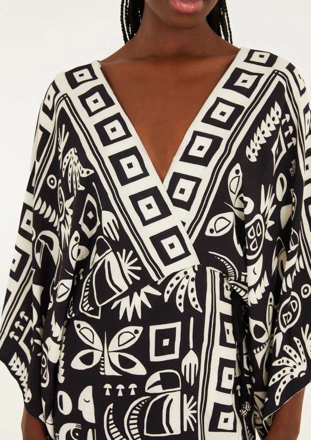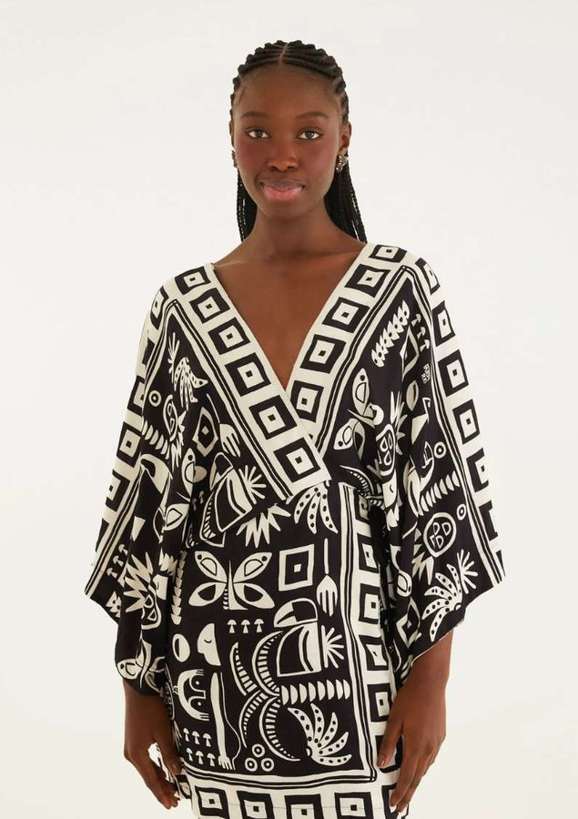 vestido curto estampado lenço tropicano. apresenta decote em v que complementa as linhas suaves do design, enquanto as mangas amplas adicionam um toque moderno. confeccionado em tecido leve, garante conforto e estilo. perfeito para ocasiões casuais.