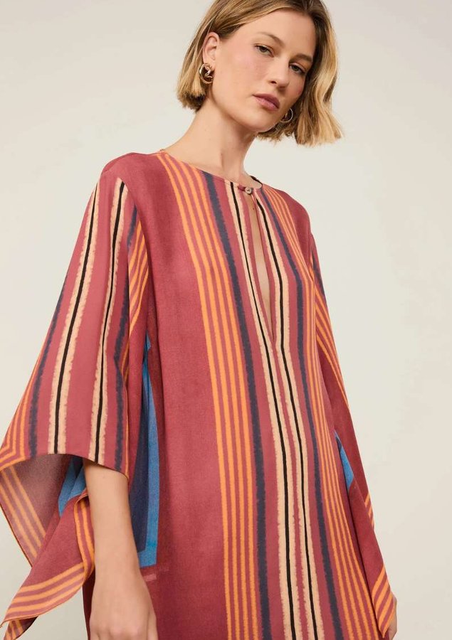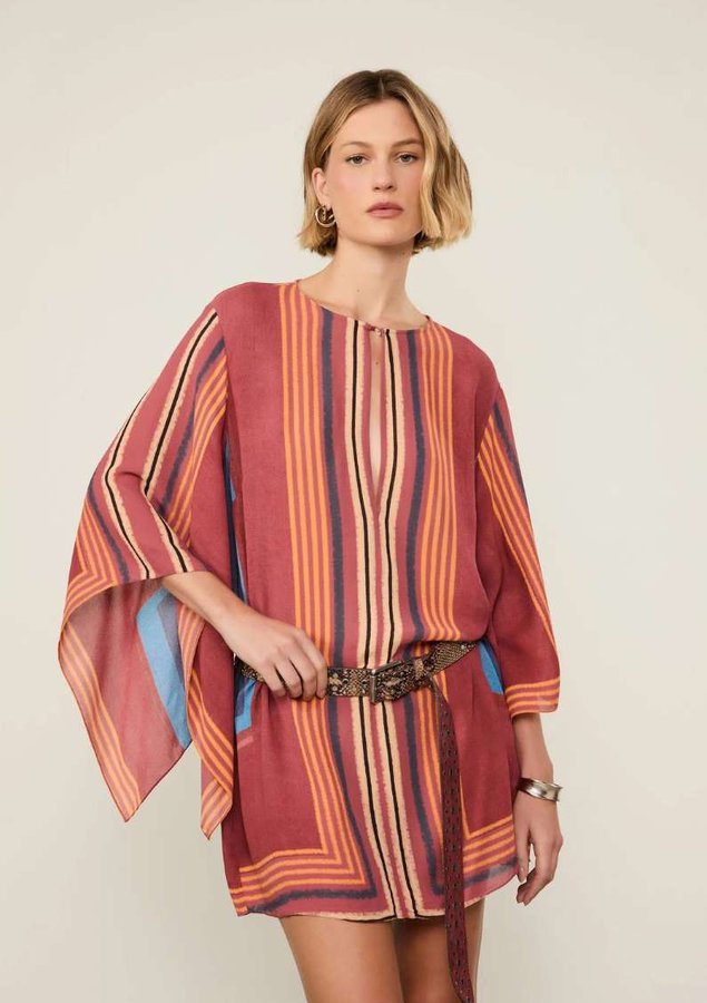 Vestido Curto Estampado com abotoamento frontal no decote redondo, recorte no busto, mangas longas e amplas e shape reto. O modelo surge como uma escolha easy chic para a temporada.