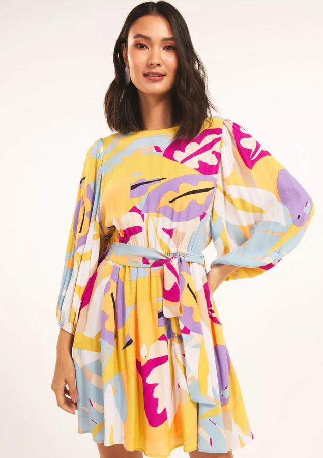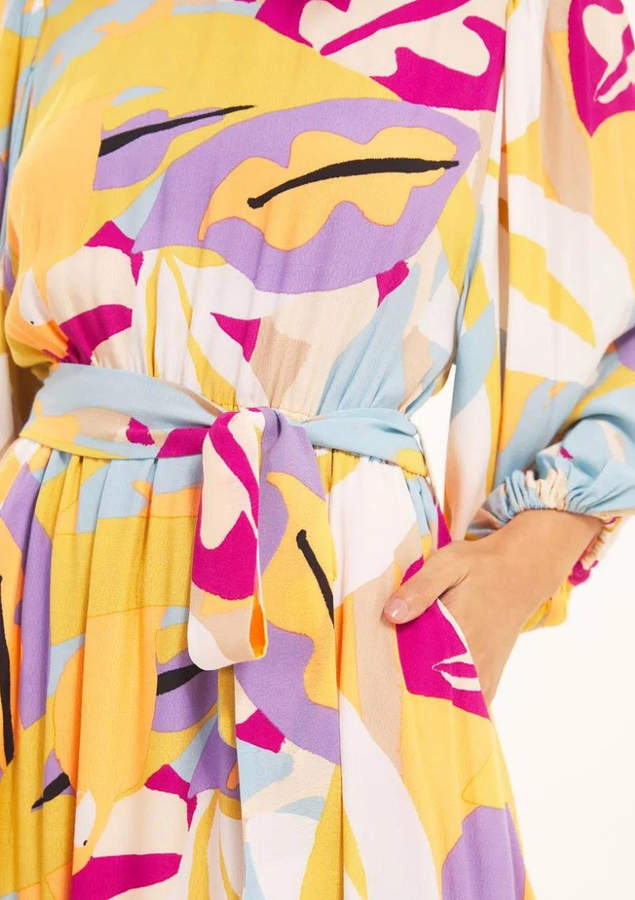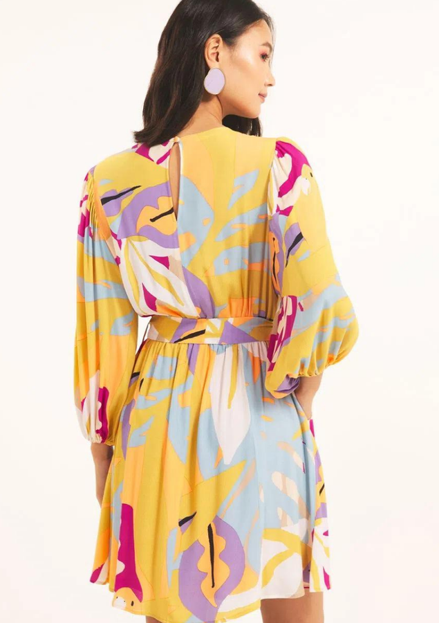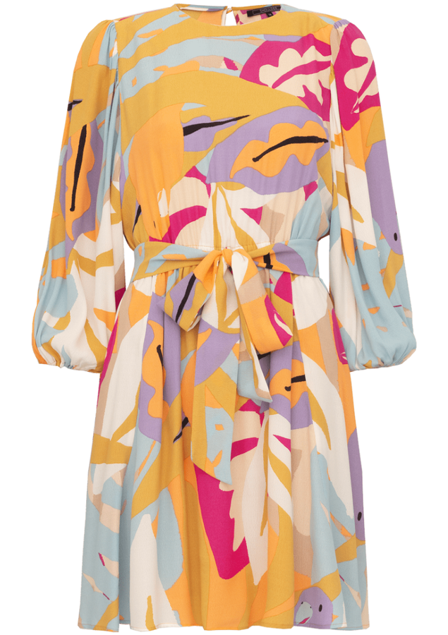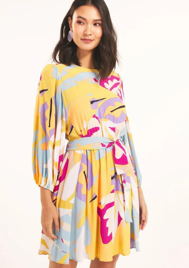 Vestido curto, manga 3/4 bufante, modelagem evasê, decote redondo frontal, fenda nó mdecote costas com fechamento botão, cintura com elástico, bolsos laterais , elástico punho e faixa amarração.