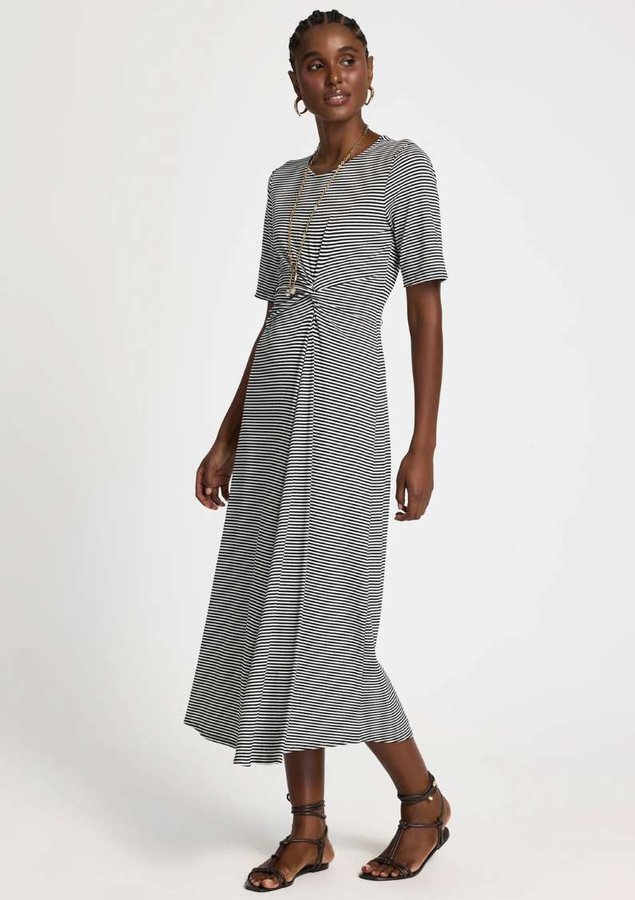 Confeccionado em malha, o Vestido possui modelagem midi evasê, decote arredondado, mangas curtas, padronagem listrada em preto e branco, detalhe de torção frontal que forma drapeado vertical no centro da peça, costas lisas sem recortes, fechamento posterior por botão e acabamento pespontado na barra.