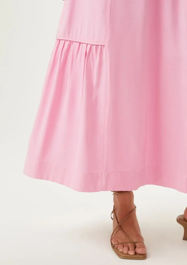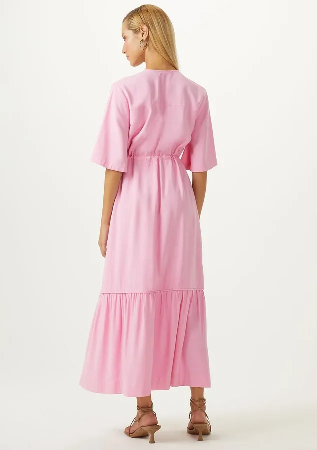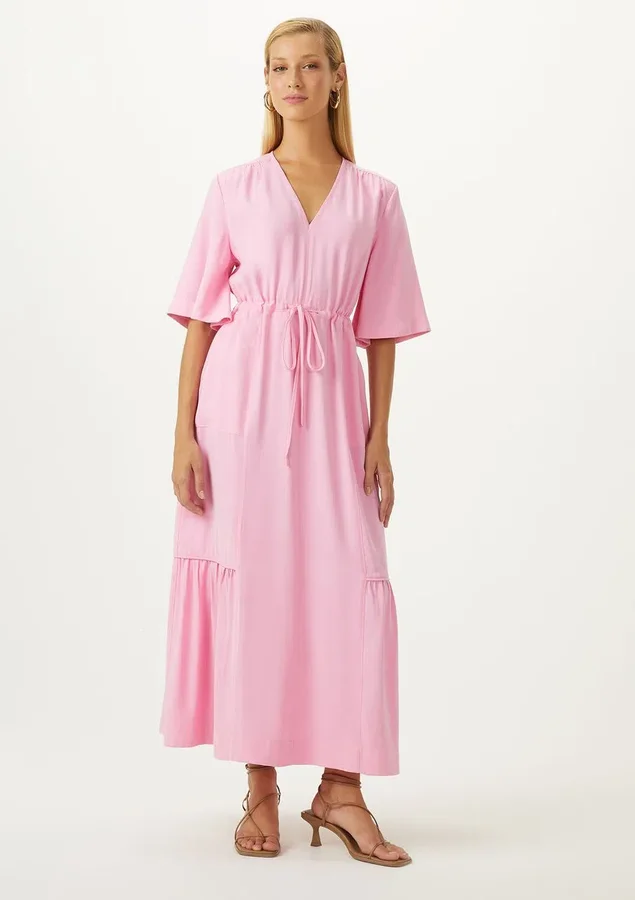 Vestido Comprimento midi, Manga curta, Modelagem evasê, Decote V, Babado maria na saia, Amarração funcional na cintura, Bolsos laterais e Manga ampla.