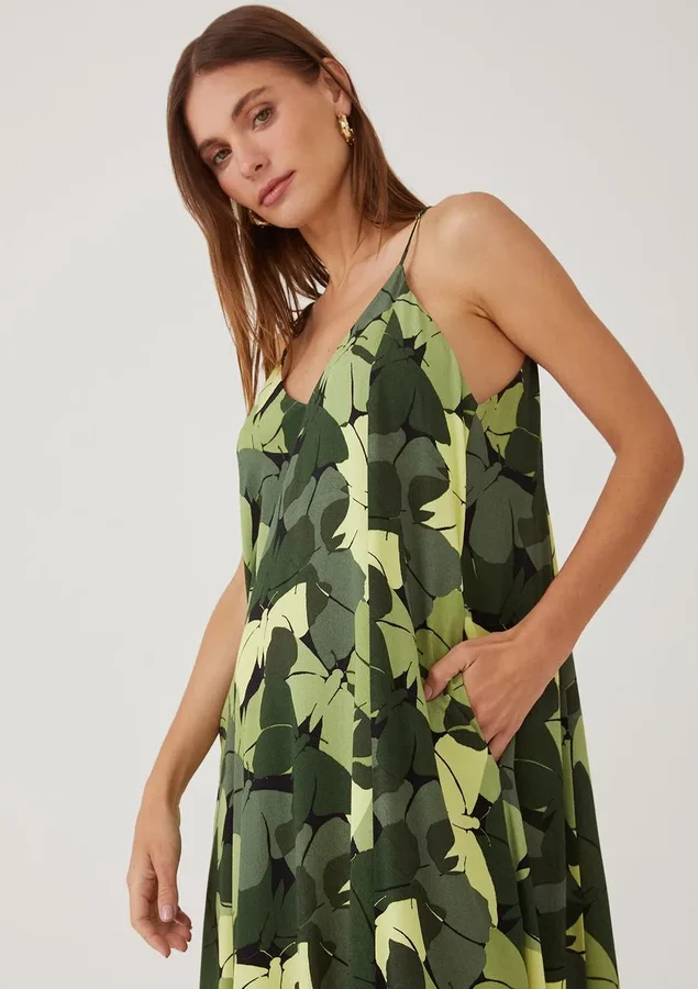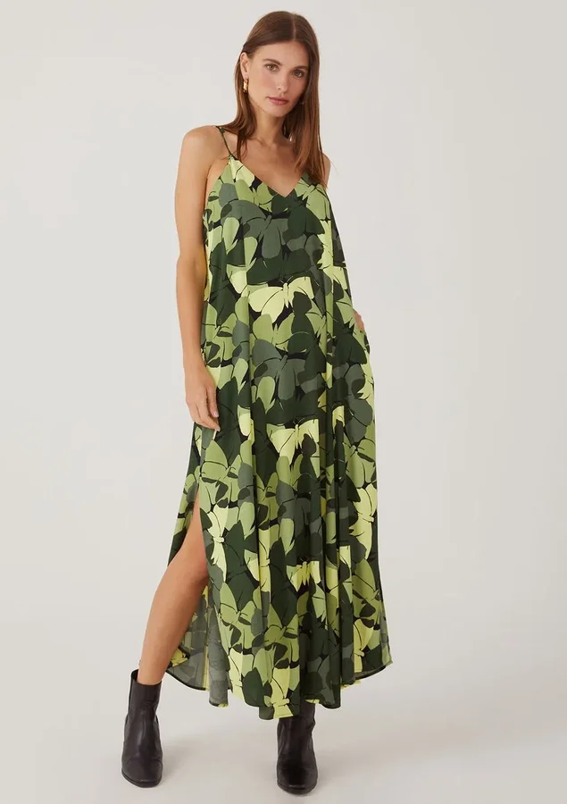 Vestido Comprimento midi alongado, Alça fina, Modelagem evasê, Decote V frente e costas, Fenda lateral, Regulador na alça