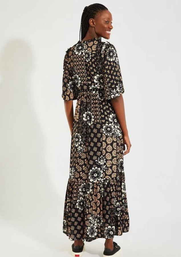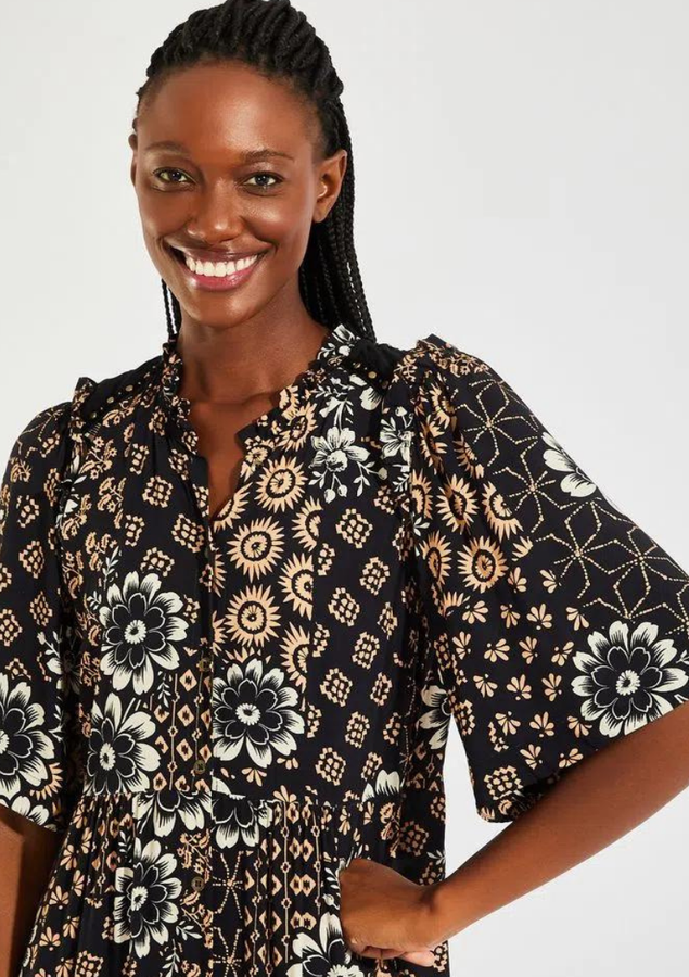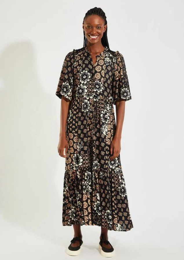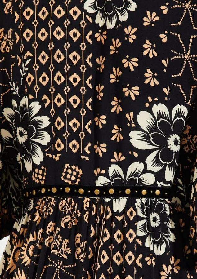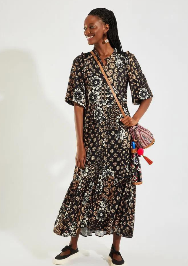 Vestido midi com estampa Nara. O modelo possui mangas amplas e detalhe de sutil recorte em v.