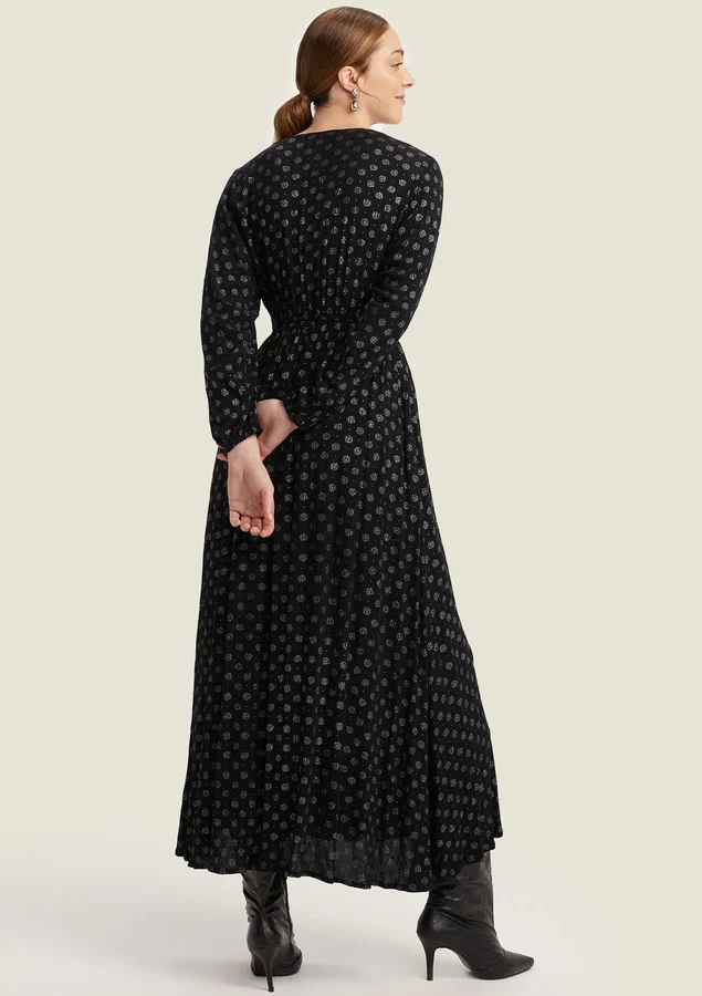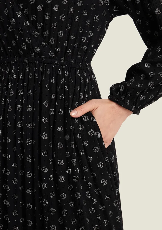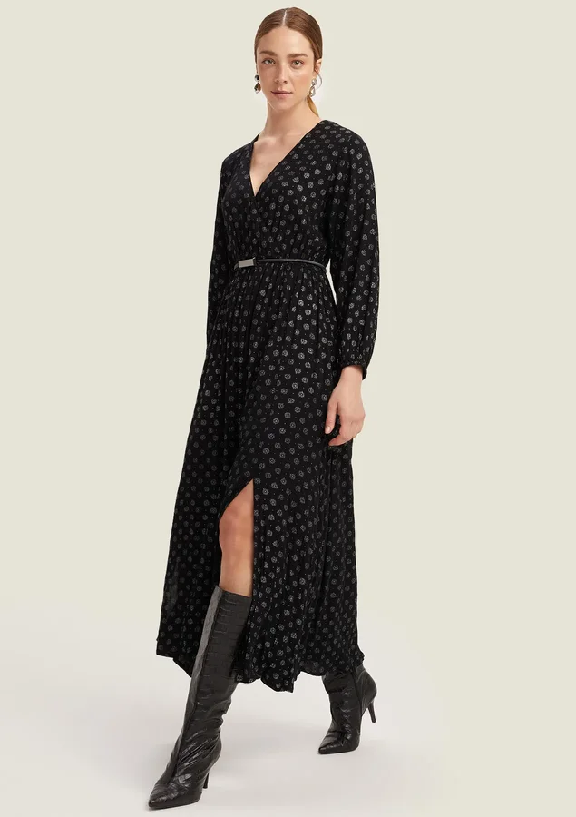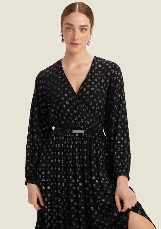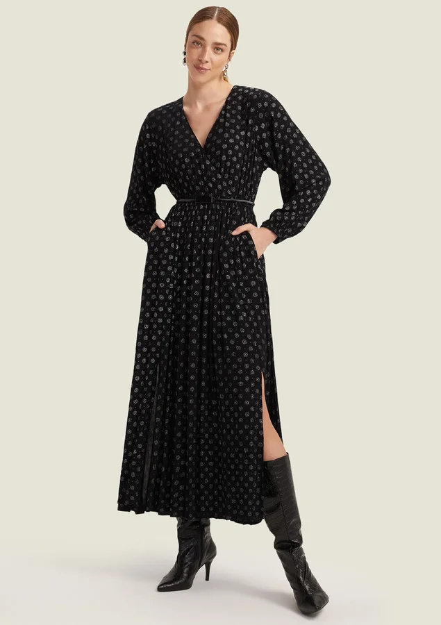 Vestido Comprimento midi, Manga longa, Modelagem evasê, Tecido: viscose texturizada, Decote V transpassado, Elástico na cintura e nos punhos, Bolsos laterais e Fenda nas laterais.