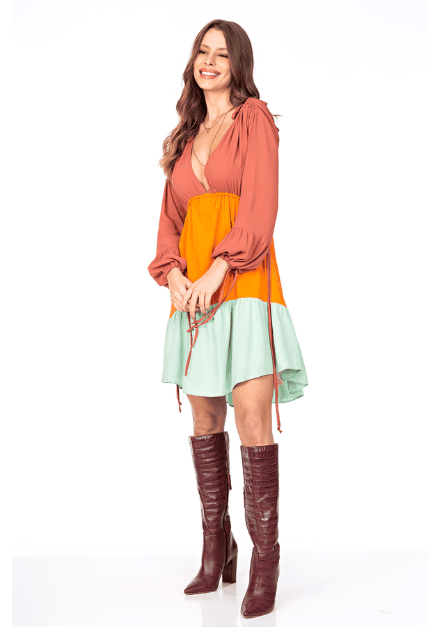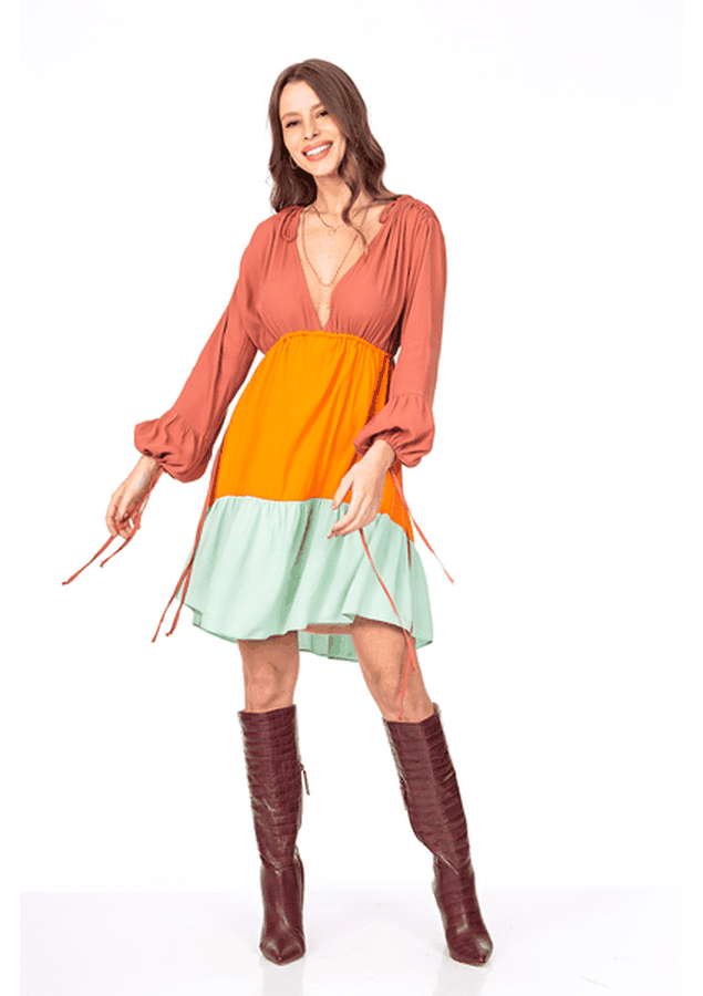 Vestido manga longa com recortes. Mangas ajustáveis nos ombros por amarração, dando um detalhe do tecido franzido, abaixo do busto possui uma amarração para melhor ajuste no corpo, um detalhe em recorte com os punhos mais amplos, transformando a peça manga de sino, ou se ajustados pelas amarrações, em manga bufante.
