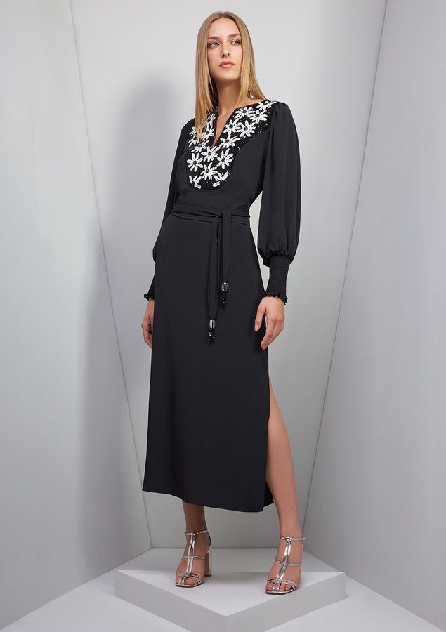 Vestido longo em crepe, com mangas compridas. As mangas são fluidas com leve franzido nos ombros e lastex formando uma pala larga no punho. Abertura inferior nas laterais do vestido. Decote em V com uma pala bordada em paetê com flores bordadas e aplicação de bordado representando o miolo da flor em pedras pretas formando outra flor. Acompanha uma faixa separada da peça, com uma pala mais larga para ser amarrada no vestido na altura da cintura e cruzada com suas tiras mais finas nas extremidades. As pontas desta tira possuem penduricalhos formados por uma peça resinada com riscos preto e branco e um cacho de miçangas pretas e pedras assimétricas.