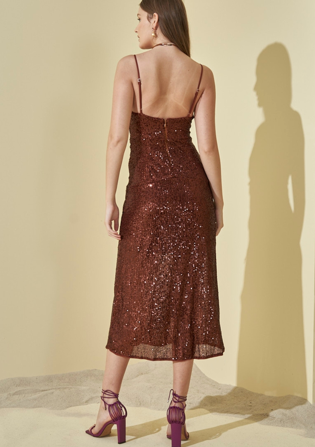 A peça possui alças finas com reguladores, decote cava, frente com detalhe túnel para fita, comprimento midi, fecho traseiro por meio de zíper, shape slim e modelagem reta.