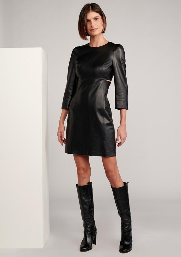 O Vestido é confeccionado em couro, possui caimento acinturado, gola redonda, mangas 3/4, detalhe de vazados nas laterais, fechamento posterior por zíper, comprimento curto e acabamento pespontado.