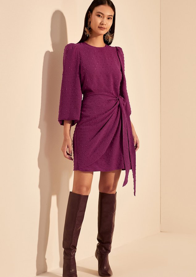 Vestido curto com decote fechado de manga puff, modelagem soltinha com ajuste de sobreposição de laço na cintura que proporciona charme e elegância ao vestido.. Confeccionado crepe leve flow sem transparência. Aposte nos saltos ou até mesmo com rasteiras.