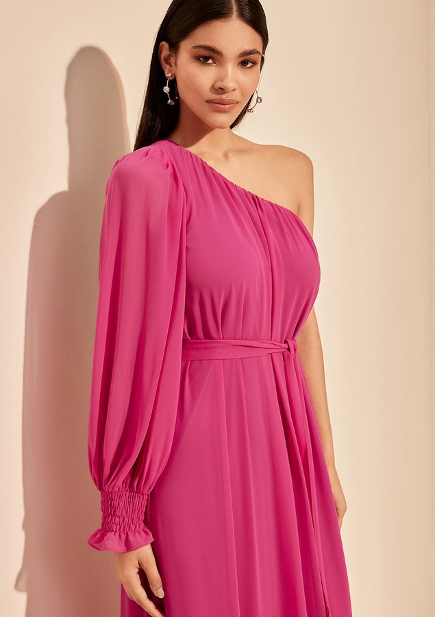Vestido longo decote de um ombro só, manga puff com ombreiras internas, saia ampla forro em todo seu comprometimento, tecido de chiffon com leve transparência que traz leveza ao look.Combine com mini bolsa para trazer toda delicadeza do look.