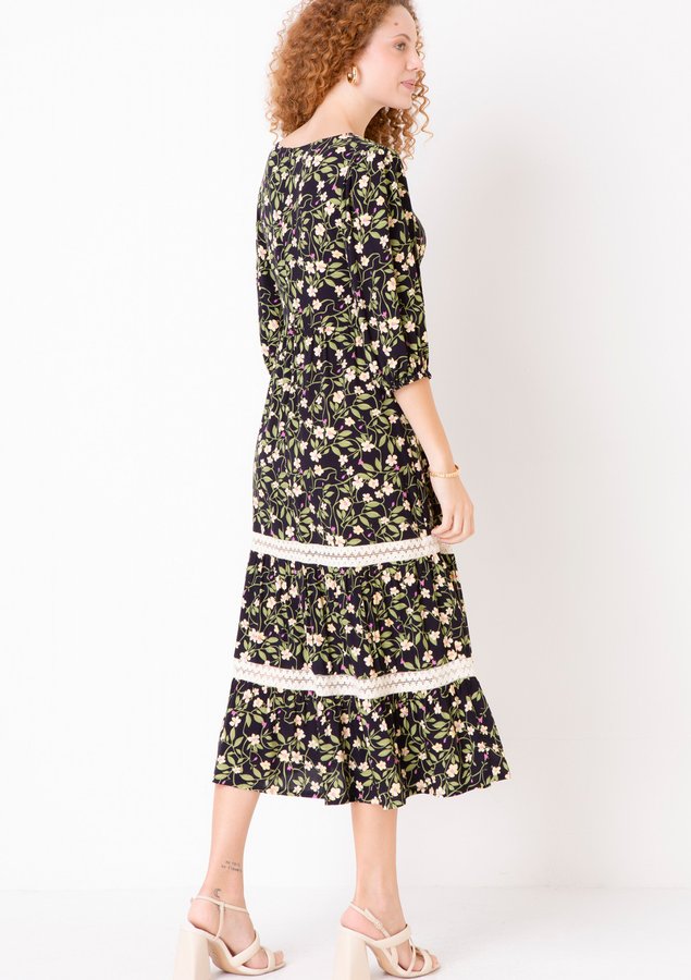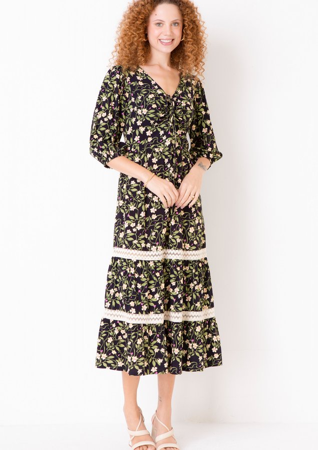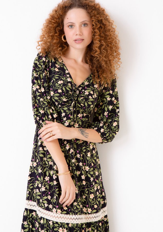 O vestido viscose, forro no busto, decote V com detalhe de franzido e amarração para ajuste no busto, ombros franzidos, elásticos nos punhos, zíper invisível na parte posterior, marias com um lindo trabalho de rendas que deu uma delicadeza a peça é bem fluído com um ótimo caimento e uma estampa floral para deixar o inverno mais leve. Atemporal para compor looks modernos, formais, joviais ou sofisticados, seja com botas, coturnos, tênis, jaquetas, tricot ou casacos para looks bem invernais e despojados. Para um inverno com muito romantismo e bem feminino!